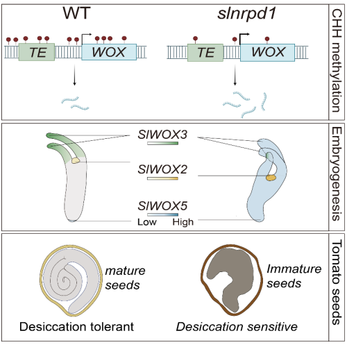 中国科学院植物研究所研究员王台、副研究员刘玲童团队解析了RdDM对番茄胚胎发育和种子脱水耐性的影响。研究发现,SlNRPD1失活导致CHH甲基化水平和24-nt siRNA下降,同时伴随着内切核糖核酸酶SlDCL2b/c/d的特异性激活与21-22 nt siRNA的积累。研究发现,番茄中转座元件和非转座子重复序列通常位于SlWOXs和SlPINs基因体内或附近,而AtWOXs和AtPINs基因座上的转座子和重复序列相对较少。NRPD1缺失引起的重复序列CHH低甲基化可能通过改变WOX/auxin信号通路的基因表达,导致胚胎发育缺陷和种子不育。