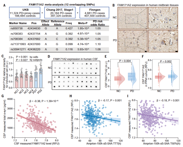 大规模全基因组关联研究发现,FAM171A2的多个突变体与帕金森病风险显著相关。同时,FAM171A2蛋白在帕金森病患者的脑脊液和大脑组织中的表达量均高于正常对照组,FAM171A2蛋白水平与帕金森病的多个神经病理标志物具有显著的病理相关性。因此,研究提出,FAM171A2是帕金森病的风险基因,参与帕金森病病理发展。