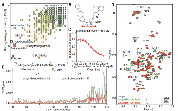 进一步,该研究通过在小鼠模型中过表达或敲低FAM171A2蛋白并结合体外细胞实验,揭示了FAM171A2介导神经元对帕金森病病理蛋白α-syn淀粉样纤维的摄取和传播的致病机制,进而导致神经毒性并加重帕金森病病理进展。体外研究发现,FAM171A2通过胞外结构域1与α-syn淀粉样纤维的羧基末端区域通过静电力相互作用直接结合,且FAM171A2与α-syn淀粉样纤维具有与α-syn单体相比更高的结合亲和力。研究基于已有的相互作用结构模型,通过人工智能的蛋白结构预测和高通量虚拟筛选技术,得到抑制FAM171A2与α-syn淀粉样纤维结合的小分子抑制剂bemcentinib。该小分子抑制剂在体外细胞模型中可有效抑制多巴胺能神经元对α-syn淀粉样纤维的摄取。