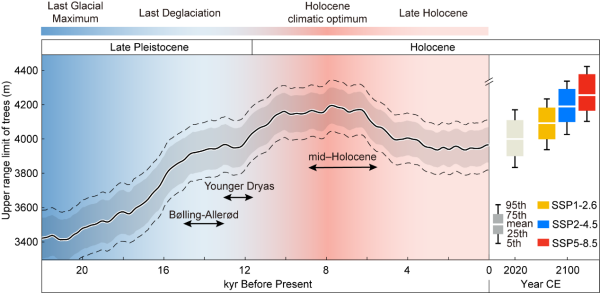 研究发现,青藏高原平均树线海拔在末次冰期最低(~3426米),在全新世大暖期间达到最高(~4187米),比当前的平均树线(~4009米)高约180米;冰期与间冰期树线波动幅度达850米,导致间冰期高山特有物种栖息地面积仅为冰盛期的~50%。