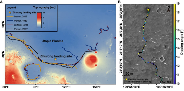 中国首辆火星车“祝融号”于2021年5月15日着陆于乌托邦平原南部,搭载空天院研制的火星次表层穿透雷达,以探测地下结构和可能存在的水冰。“祝融号”行驶路线位于前人提出可能存在的古海洋海岸线以北约280公里处,海拔比该海岸线低约500米。