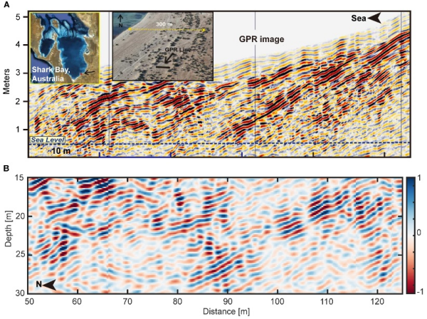 该研究通过分析“祝融号”雷达低频通道实测数据,在火星车沿途地表以下10米至35米深度范围内识别出76个地下倾斜反射体。这些发射体空间分布广泛且均匀,覆盖范围超过1.3公里,所有反射体均呈现向北方低地方向倾斜的特征,倾角介于6°至20°之间,平均倾角为14.5°,且在相同位置的不同深度可观测到多个平行分布的反射体。这些层理结构与地球沿海沉积物的雷达成像结果相似,其一致性和物理特性排除了风成沙堆、熔岩管道或河流冲积等其他成因。这些沉积物的大规模存在表明,风浪驱动的沿岸输送为海岸线提供了稳定的泥沙净流入并形成了海岸线前积层。这种结构只有在持久稳定的大型水体环境中才能形成,而非仅仅是局部和短暂的融水现象。