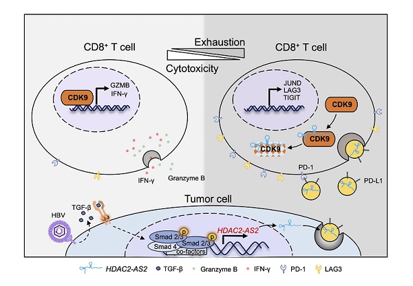 上述研究表明,乙型肝炎病毒阳性肝癌中TGF-β信号通路上调的非编码RNA HDAC2-AS2通过外泌体靶向CD8+ T细胞中CDK9蛋白,导致CD8+ T细胞功能受损,促进肿瘤细胞的免疫逃逸。
