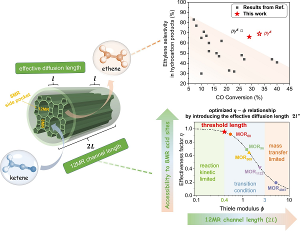 丝光沸石(MOR)分子筛具有独特孔结构,其中8元环内的酸性位为合成气转化的活性位点,12元环孔道为分子的传输通道。该研究以MOR分子筛作为模型催化剂,分析了不同12元环孔道长度的MOR在合成气转化中的传质效应,建立了活性位的可及性与催化性能的定量关系。研究通过分析有效扩散长度、Thiele模数与反应速率有效因子之间的关系,确定了在合成气转化反应中12MR孔道长度为60nm,接近消除扩散限制的关键阈值。基于此,研究优化了ZnAlOx-MOR双功能催化剂,实现了一氧化碳转化率33%、乙烯选择性69%的优异性能。