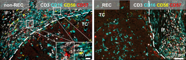 非复发和复发组织中的多色免疫组化染色:与复发肝癌相比,非复发肝癌患者的肿瘤侵袭前缘区域NK细胞更丰富
