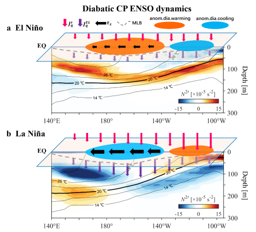 近日,中国科学院海洋研究所王凡团队揭示了海洋次表层混合对中部型(CP)厄尔尼诺和南方涛动(ENSO)的非绝热正反馈机制。