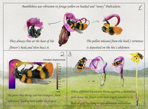 熊蜂在有喙马先蒿上进行蜂振传粉,熊蜂访花的咬合点正是振动能量传递的最优激励点;只有在马先蒿喙长与访花熊蜂体长相匹配时,两者共振促进花粉高效释放。