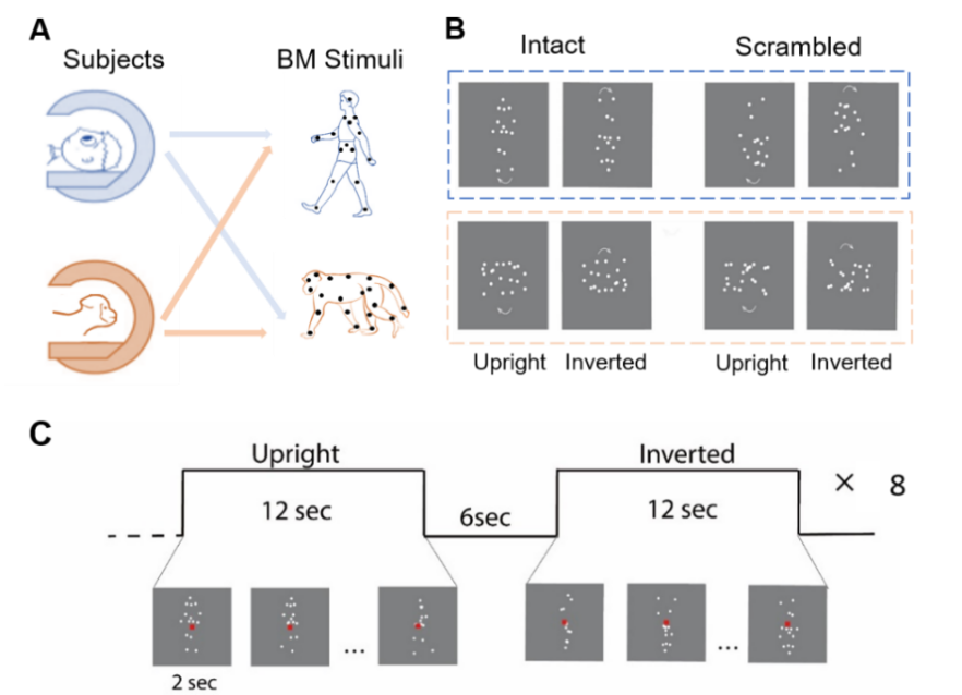 中国科学院心理研究所蒋毅研究组和生物物理研究所刘宁研究组开展了跨物种研究,利用核磁共振技术记录人类被试和猕猴被试分别观看正立和倒置的同物种与跨物种生物运动的大脑反应。