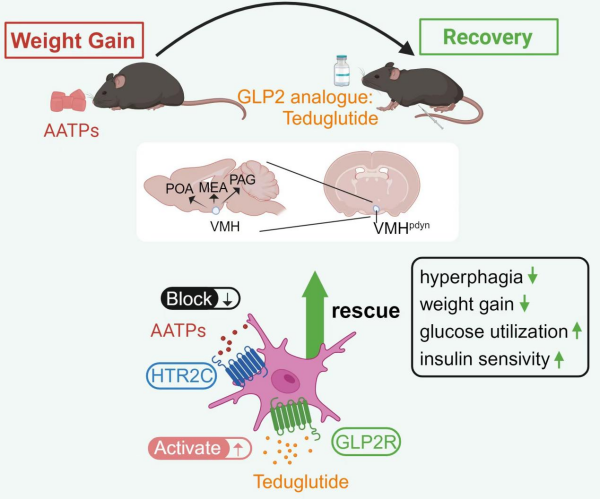 奥氮平等抗精神病药物通过抑制多巴胺和5-羟色胺受体,用于治疗精神分裂症等精神疾病,但引发了代谢副作用这一临床难题。急性使用此类药物或导致低体温,长期使用常伴随体重增加、胰岛素抵抗以及2型糖尿病风险升高。尽管临床上尝试使用二甲双胍或胰高血糖素样肽-1受体激动剂来缓解这些副作用,但效果有限,尤其是对急性低体温的改善几近无效。研究通过小鼠模型发现,胰高血糖素样肽-2类似物替度鲁肽能够通过激活VMHPdyn神经元,逆转奥氮平对这些神经元的抑制作用,从而改善低体温、体重增加及血糖异常等代谢紊乱。