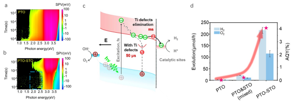 该研究针对铁电材料光生电荷分离与催化活性不匹配问题,以单畴钛酸铅为研究模型,探讨了其表面结构与电荷动力学特性。研究显示,PbTiO3正极化面存在Ti空位缺陷,且这些缺陷作为电子捕获中心,导致电荷复合并限制光催化效率。空间和时间分辨光谱分析发现,SrTiO3的生长消除了正极化面Ti缺陷相关的捕获态,降低了光生电子的捕获与复合,使电子寿命从微秒量级延长至毫秒量级,到达反应活性位有效参与反应,从而提升了水分解效率。