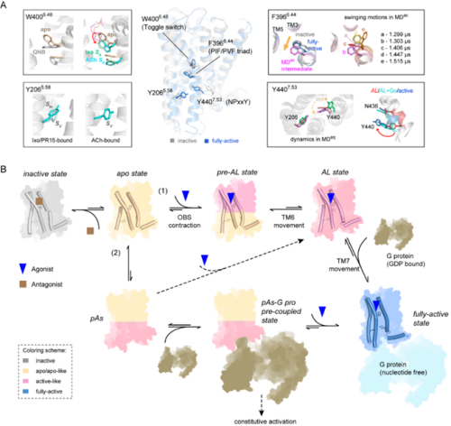 该研究揭示了受体构象变化的时序/动态过程,突破了传统“两态模型(非激活/激活)”的理论框架,发现了毒蕈碱型乙酰胆碱受体激活存在多步骤动态路径的重要特征。同时,研究发现不同配体的结合以动态变化的形式编码储存在芳香环的运动中。这一成果为基于动力学的靶向药物设计提供了新视角。