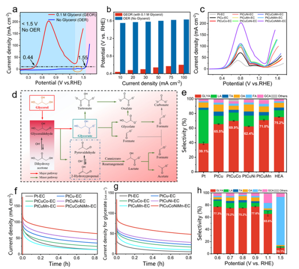 中国科学院宁波材料技术与工程研究所科研团队致力于电解制氢催化剂的研究。面向电解制氢阳极析氧反应能垒高、动力学缓慢和阳极产物价值低的难题,该研究采用甘油电氧化反应替代析氧反应,降低电解制氢的能耗同时能够获得高附加值化学品。针对甘油氧化反应路径多、产物复杂且选择性低等挑战,研究基于理性材料设计发展了高熵催化剂(PtCuCoNiMn)。该催化剂可实现在0.2 A cm-2下高选择性制备甘油酸。研究还搭建了一套小型电解槽,通过间歇电解实现了0.2 A高电流密度下催化剂的稳定运行。原位谱学表征发现,Pt为催化位点,其甘油氧化为甘油酸的反应路径是端羟基的活化与H解离→中间体甘油醛的生成→甘油醛至甘油酸的电氧化转化。密度泛函理论计算发现,甘油醛脱水反应的难易程度是决定是否产生乳酸的关键环节。Cu的引入在热力学上抑制了副产物乳酸的生成,在动力学上促进了目标产物甘油酸的生成,而Co、Ni、Mn可调节催化表面氧化态以保护Pt活性位点。