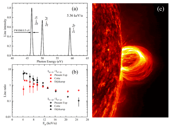 (a-b)实验所得N5+与He电荷交换EUV谱线和线强比;(c)日冕物质抛射示意图