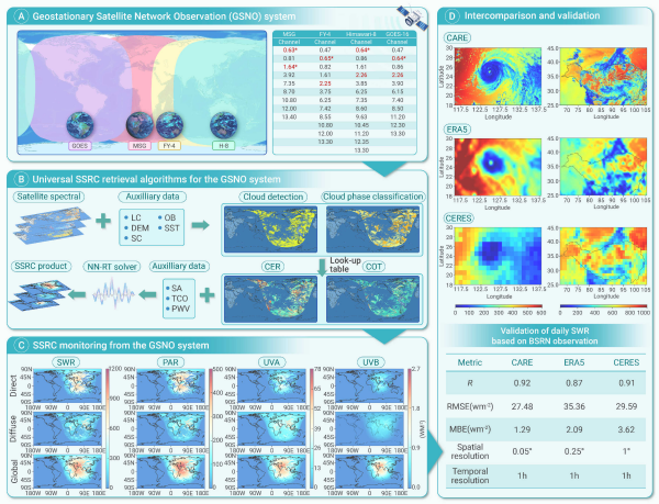 近日,中国科学院空天信息创新研究院研究员胡斯勒图和石崇等,联合国家卫星气象中心、中国科学院国家空间科学中心、中国科学院大气物理研究所、日本东海大学、日本东京大学、日本千叶大学、法国里尔大学、英国气象局等科研人员,构建了基于国际上最新一代地球静止卫星的多星组网地表太阳辐射观测(GSNO)系统,建立了多源异构卫星观测遥感模型,实现了近全球尺度地表太阳辐射最高时空分辨率的探测能力,并同步提升了探测精度。GSNO系统如同给地球表面装备了“阳光扫描仪”,可精确监测地表太阳辐射变化,为清洁能源利用、农业估产、气候变化应对、人体健康等提供精准数据支撑。