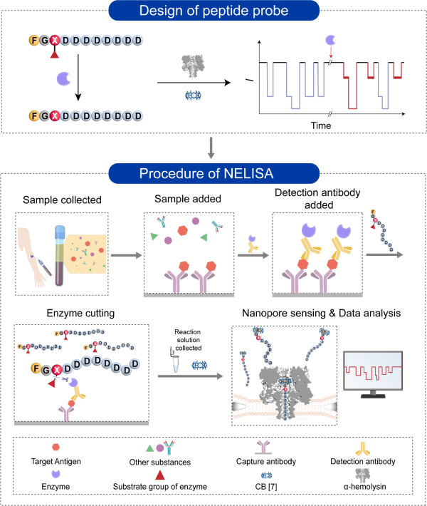 中国科学院化学研究所吴海臣课题组开展了基于纳米孔技术的生物标志物检测研究,取得了系列研究进展。近日,研究团队和合作者在纳米孔生物标志物检测技术方面取得重要进展。研究构建了ELISA中常用的几种酶的特异性响应多肽探针FGXD8⊂CB[7],用其代替传统的显色底物用于ELISA的酶促反应。在反应结束后,使用α-溶血素纳米孔对酶促反应产物进行检测,建立探针信号频率与待测物浓度的关系,从而实现生物标志物的定量检测。这类多肽探针在夹心法ELISA和竞争法ELISA的应用中均表现出优异的检测灵敏度,检出限最低可达阿摩尔(aM)级。此探针信号特征性强,无相互串扰,能够实现6种生物标志物的同时定量分析。在临床血液样本检测中,与临床通用检测方法化学发光免疫分析的结果吻合度超过90%,且检出限低3-4个数量级。