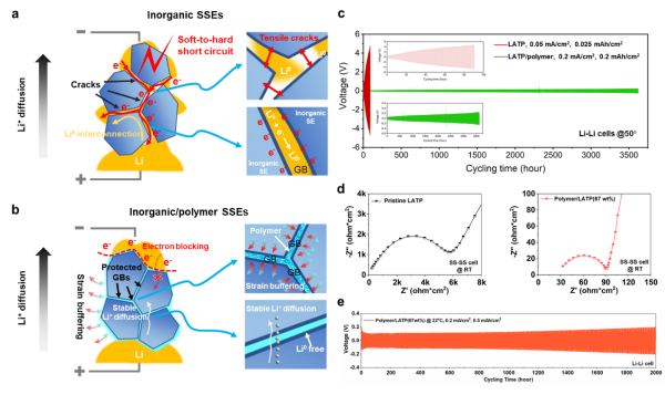 基于上述发现,研究团队利用三维电子绝缘且机械弹性的聚合物网络,发展了无机/有机复合固态电解质,有效抑制了固态电解质内部的锂金属析出、互连及其诱发的短路失效,显著提升了其电化学稳定性。