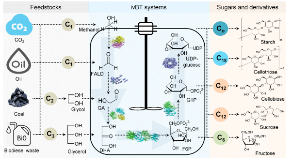中国科学院天津工业生物技术研究所研究团队在前期人工转化二氧化碳合成己糖研究工作基础上,设计构建了非天然蔗糖合成途径,与自然合成途径相比,反应步骤和ATP消耗显著降低。研究针对途径中的关键酶进行分子改造,催化效率提升70倍。围绕体外生物转化体系中的多酶适配性研究,科研人员开发循环扫描迭代进化方法,蔗糖合成转化率提高至86%,产物浓度达到14g/L。基于蔗糖合成路线,研究设计了自循环驱动的淀粉合成方法,无需添加引物即可实现生物转化甲醇合成直链淀粉,且具有较高的合成效率。