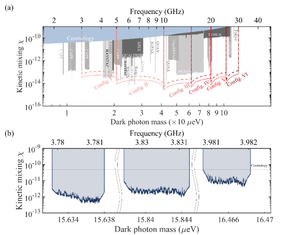 该研究提出利用超导量子比特直接搜寻超轻暗物质的实验架构。研究利用微纳加工技术,在单个芯片上集成多个频率可调的超导量子比特,形成可扩展的暗物质搜寻架构。这一架构可对暗物质多能区同步开展高灵敏扫描探测,有望解决测量范围与灵敏度难以兼顾的问题。同时,研究设计制作了三比特超导量子芯片,可同时对15.632-15.638、15.838-15.845及16.463-16.468µeV三个能区的暗光子进行搜寻,并给出相应区间内最严格的暗光子-光子耦合界限。研究发现,实验结果相较此前基于天文观测的界限提升了1至2个数量级。