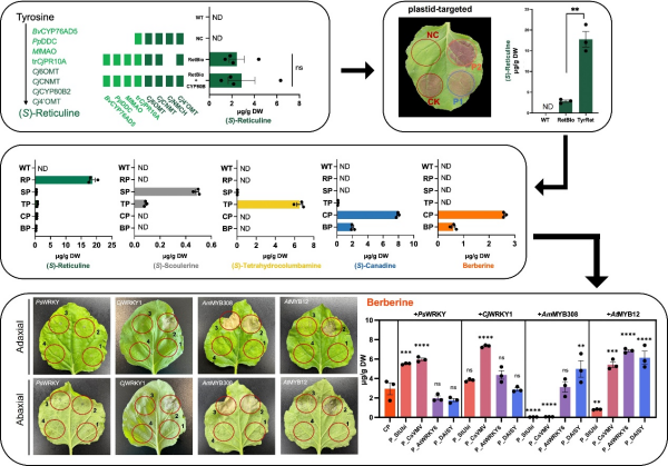 研究团队利用植物特有的空间区室化与代谢稳态特性,探讨复杂BIAs有效合成新策略。通过质体代谢重构与转录因子精细调控工程,团队在本氏烟草中实现了小檗碱的从头合成,建立了稳定高效的植物底盘系统,为基于植物底盘的BIAs及其他高值天然产物的绿色制造奠定了基础。