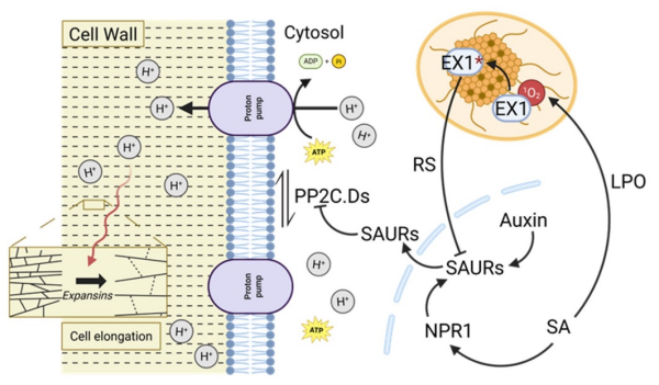 该研究探讨了胁迫激素水杨酸在黑暗中调节拟南芥发芽过程中的下胚轴伸长。研究揭示了胁迫激素水杨酸抑制的下胚轴生长呈剂量依赖性,以及npr1突变体对胁迫激素水杨酸处理更敏感,这凸显了NPR1在黑暗中胁迫激素水杨酸积累下维持生长的作用。研究进一步发现,核定位的NPR1通过维持生长素应答基因表达,以消减胁迫激素水杨酸诱导的生长抑制。过表达SAUR19或SAUR63完全恢复了npr1在黑暗中的表型。同时,研究显示,胁迫激素水杨酸在黑暗中触发脂质过氧化,产生1O2并激活EX1介导的逆向信号,从而抑制生长素相关基因,限制下胚轴伸长。