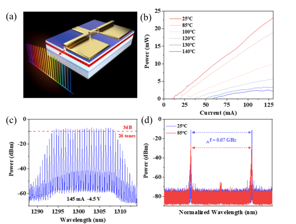 在室温(25°C)下,激光器实现了14.312nm的3dB光学带宽,可产生26个并行信道,每个信道均可承载128Gb/s的PAM-4调制信号;在高达140°C的温度下,该器件仍保持稳定锁模;在85°C的工业级标准高温下,关键性能几乎无衰减,仍能支持22个信道稳定工作,实现总量2.816Tb/s的数据传输。