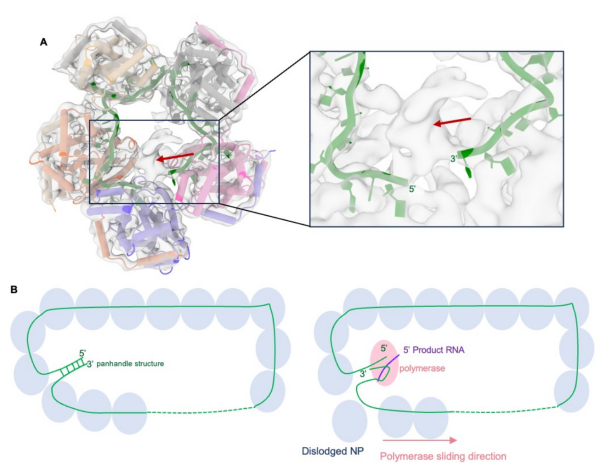 基于以上研究,团队提出SFTSV RNP组装模型。SFTSV RNP可通过RNA的“锅柄”结构及NP-NP相互作用形成环状构象,病毒RNA聚合酶通过识别该锅柄结构来启动RNA合成。在延伸过程中,靠近复制中心的NP暂时解离,使包裹的基因组RNA暴露出来,从而被RNA聚合酶识别。同时,NP通过其柔性的N-arm维持空间定位。当RNA聚合酶通过后,暂时脱离的基因组RNA会重新被NP包裹。