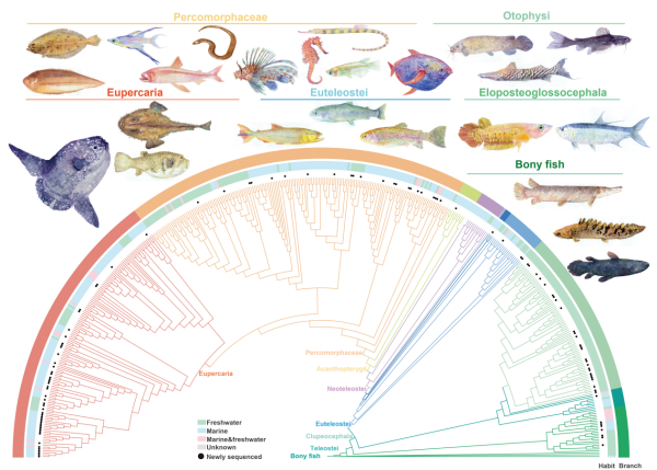 中国科学院水生生物研究所团队,通过从头测序并整合分析464种真骨鱼类全基因组,构建了目前覆盖度最全的鱼类基因组图谱,为解析鱼类演化历程提供了较高的分辨率。