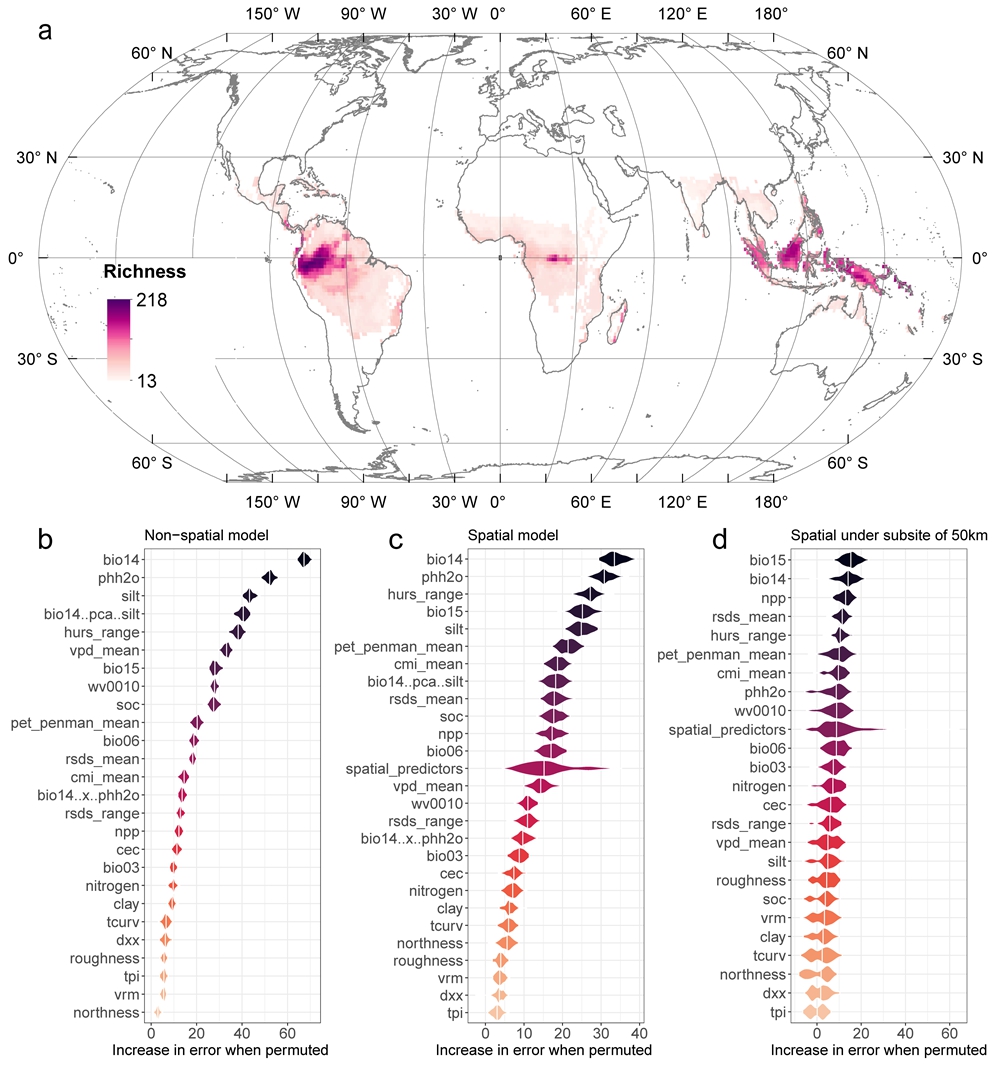 研究结果揭示了明确的环境因子驱动模式:水分可用性是影响树种α多样性的最主要因素,而土壤特性在局域尺度上起着同样显著调节作用。进一步分析表明,这些环境因子存在“共同限制”效应,即热带树种多样性受制于多个环境维度的协同作用,而非单一因子的独立控制。这也解释了为何在亚马逊流域等水热与土壤条件俱佳的区域,会形成全球树种多样性极高的森林群落。