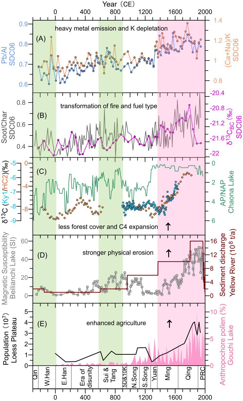 结果显示,化学风化强度总体受控于气候,但自公元580年(隋朝)以来,钾元素的淋滤与气候变化解耦而呈现持续上升趋势,并在寒冷的明清时期达到顶峰。这暗示流域农业活动对化学风化的扰动。此外,黑碳揭示过去2200年黄河流域的火强度呈现长期减弱趋势,源于森林砍伐导致的流域植被减少。特别是,研究人员发现自公元1350年(明朝)前后,火的燃烧类型和植被组成类型均发生了显著变化。烟炱/焦炭比值指示的火类型在1350年从以气候主导的低温焖烧,转向更多人为引发的高温明烧。与此同时,黑碳的碳同位素组成呈现明显正偏趋势,指示燃料来源从C3天然木材转变为高粱、玉米等C4作物秸秆。这一转变反映了随着明清人口急剧增长,人类为应对粮食和燃料危机而进行的种植和能源革新。