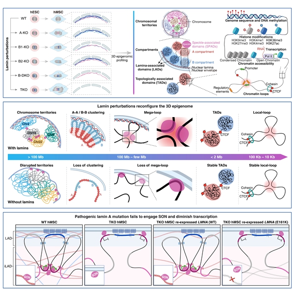 该研究在hESCs及其分化来源的hMSCs中构建了lamins的单、双、三敲除模型,系统揭示了lamins在基因组径向定位与空间折叠中的核心作用,为理解生理性衰老及防治衰老相关疾病提供了新线索和潜在靶标。同时,该研究揭示了核纤层病的潜在机制,将相关疾病的病理认知推向了统一的“三维基因组紊乱”框架,为开发靶向lamin-SON轴的治疗策略奠定了理论基础。
