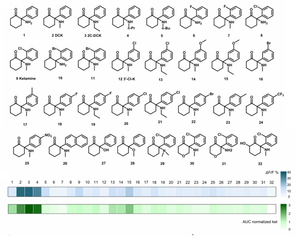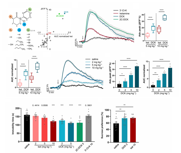 研究团队发现氯胺酮通过直接调节细胞能量代谢,增加细胞内腺苷,内侧前额叶皮层腺苷信号是介导氯胺酮快速抗抑郁作用的关键信使。研究者以增强腺苷释放为表型指标,设计并筛选了一系列氯胺酮衍生物,对氯胺酮结构进行系统性改造,重点修饰其芳香环氯取代基、环己酮第六位及氨基侧链。其中,去氯氯胺酮在同等剂量下诱导的腺苷释放显著强于氯胺酮;去氯氯胺酮在极低剂量下即能诱发更强、更持久的腺苷信号,并在行为学测试中表现出优于氯胺酮的抗抑郁功效,同时其引发的运动亢进副作用显著减弱。尤为重要的是,腺苷释放能力与NMDA受体抑制效应之间出现明显解耦,提示氯胺酮的抗抑郁作用并非完全依赖于NMDA受体阻断机制。