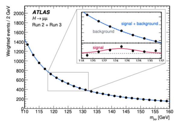 在这一工作中,中国科大团队参与了缪子的动量精细刻度,搭建了完整的数据分析框架,探讨了多种提升H→μ+μ-信号敏感度的可能方向,最终采用机器学习方法实现了敏感度最优的矢量玻色子聚合与胶子—胶子聚合产生道的信号与本底区分。团队同时协助合作组产生了高达50亿的高精度本底模拟样本,并承担了本底与数据建模,为在为海量本底事例中精细分离出稀有的H→μ+μ-信号创造了条件。在此基础之上,团队还完成了系统误差计算并得出了结论性成果。