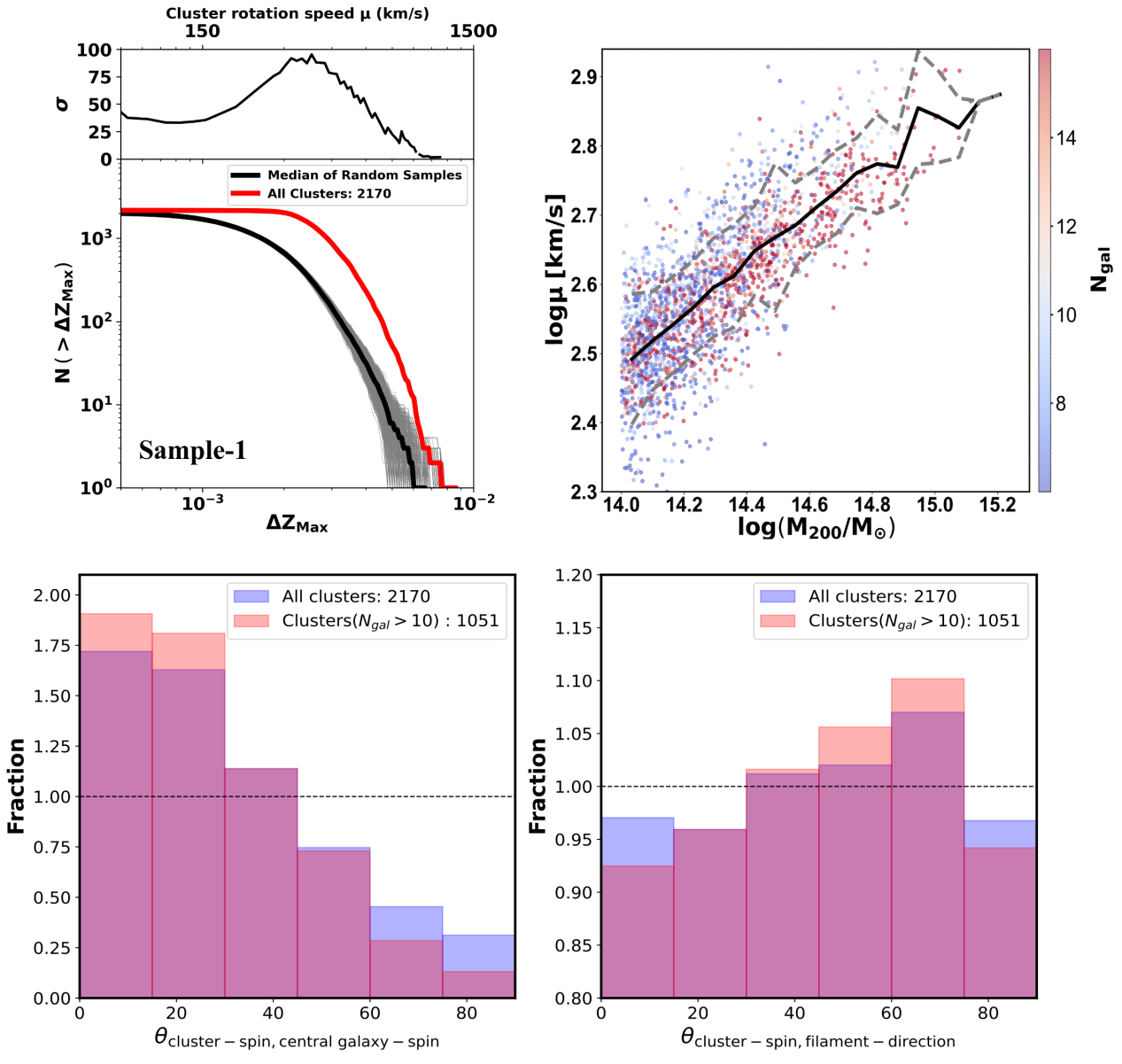 左上图:星系团自旋信号的累积分布;右上图:星系团旋转速度—质量关系;左下图:星系团自旋与中央星系自旋的关联;右下图:星系团自旋与邻近大尺度纤维结构轴的关联