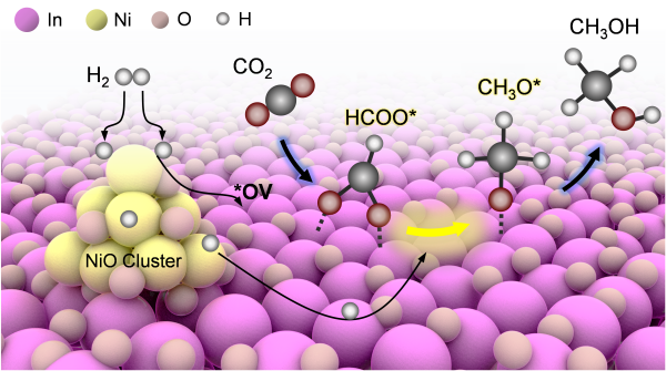 大量二氧化碳排放加速了全球变暖等环境问题,将二氧化碳转化为如甲醇等非化石来源的化学品,是一种重要的解决方法。氧化铟(In2O3)由于其表面易还原形成活性氧空位(OV)位点特性,被证明是新一代甲醇催化剂。现有研究指出,催化材料表面负载铂(Pt)、镍(Ni)等具有较强活化氢能力的金属,但目前甲醇制备效率仍不高。