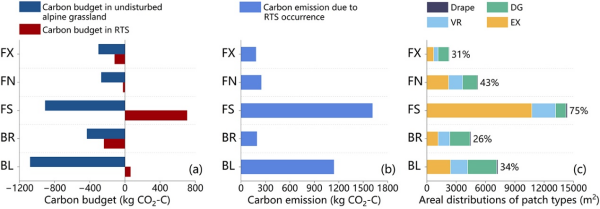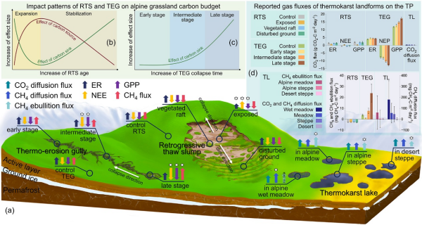 相关研究成果以Thaw slumps alter ecosystem carbon budget in alpine grassland on the Tibetan Plateau为题,发表在《自然-通讯》(Nature Communications)上。研究工作得到国家重点研发计划、国家自然科学基金和甘肃省自然科学基金的支持。