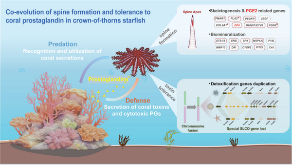 该研究聚焦珊瑚敌害物种防控问题,以南海珊瑚礁区域的长棘海星为对象,探究其适应与演化规律。研究揭示了长棘海星基因组结构演化特征,发现其基因座复制导致负责前列腺素转运的蛋白基因(SLCO家族)明显扩增。分析表明,SLCO基因扩张时间与珊瑚繁茂时期相对应,这从侧面揭示了长棘海星对珊瑚分泌物中毒性前列腺素E2(PGE2)的适应性进化策略。结合棘皮动物普遍缺乏内源PGE2合成途径的特征,研究推断,长棘海星或通过感知并利用珊瑚来源的外源PGE2信号,激活骨骼形成相关基因调控通路,从而促进棘刺与体型生长。