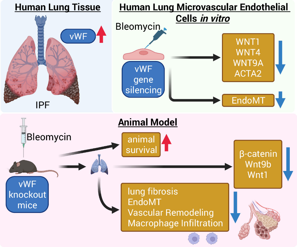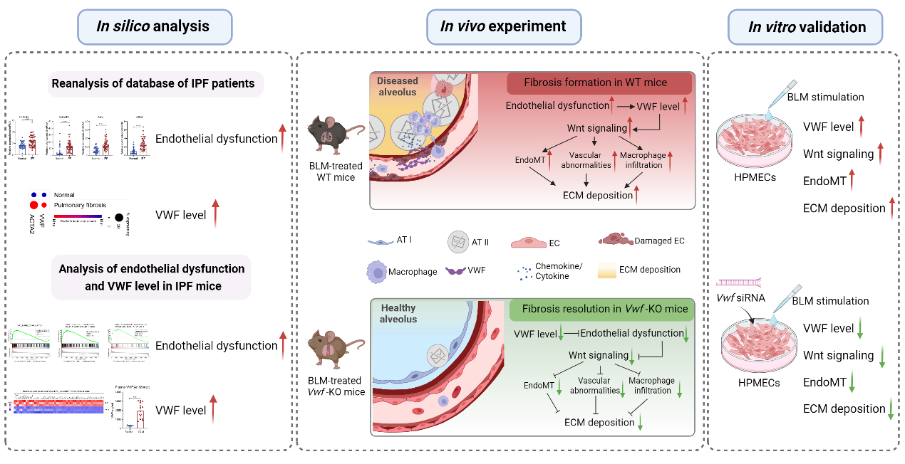 研究团队通过对IPF患者公共基因表达数据的再分析发现,IPF进展伴随着严重的内皮功能障碍,揭示了VWF与IPF的体内相关性。同时,VWF缺失/敲低可通过抑制内皮细胞获得间质样表型、维持其内皮特性、调控IPF期间的血管异常、改善内皮屏障通透性,以及减少巨噬细胞浸润等途径,来减轻肺纤维化。这一过程部分依赖于Wnt信号。