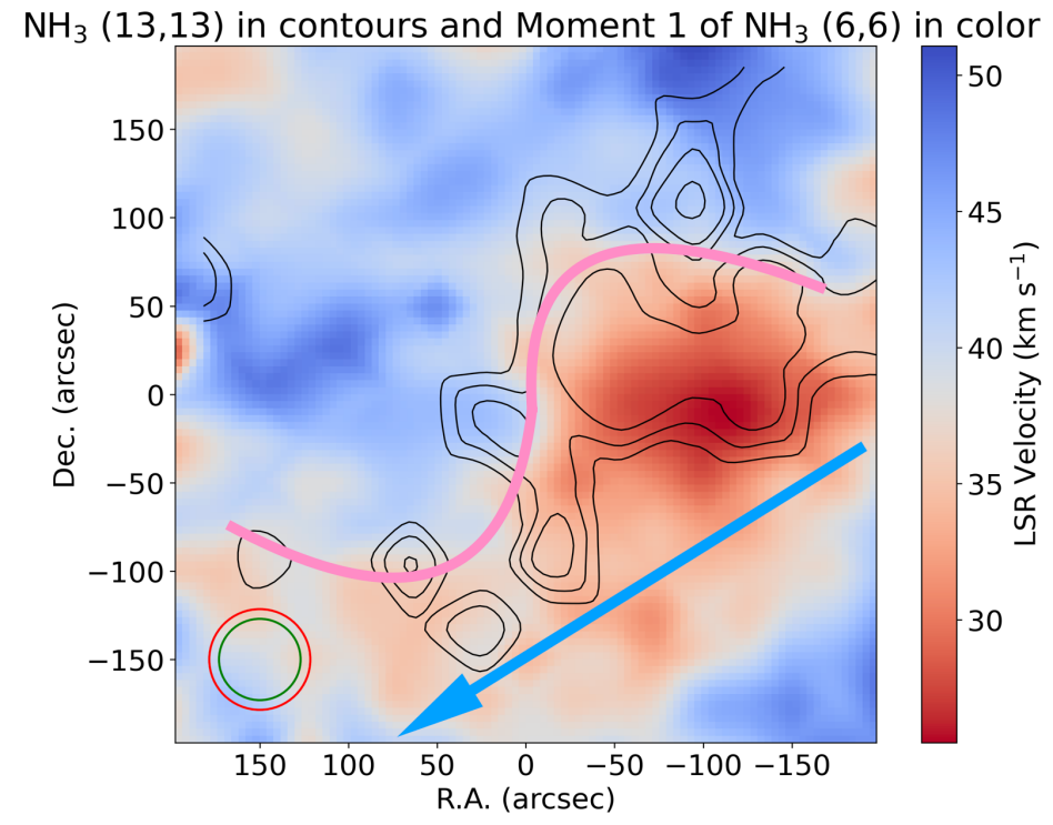 研究团队利用天马望远镜(上海65米射电望远镜)和西班牙耶韦斯40米望远镜,对CMZ分子云G0.66至0.13中的氨分子(NH3)进行了多条跃迁的观测。研究团队首次在星际空间中,探测到NH3高能级跃迁(18,18)发射线,其能级温度高达3100K。分析表明,此类高能级跃迁线来自温度超过400K的热分子气体,且其空间分布与50K至150K的温气体存在明显差异。研究团队进一步通过对比温气体速度场与热气体空间分布发现,热气体主要富集于不同分子云团的交界面区域。