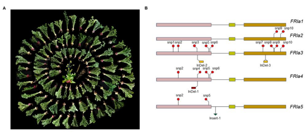 中国科学院西双版纳热带植物园研究人员对来自世界各地的104份地方种质资源的开花时间进行分析。来自不同地理区域的蔓菁开花时间表现出显著差异,这与它们生长地区的海拔和气候温度密切相关。研究进一步分析了蔓菁FRIa和FLC2基因的遗传变异及其对开花时间差异的贡献。研究结果表明,开花时间关键调控基因FRIa变异,在蔓菁开花时间的适应性性状上,特别是维持高海拔蔓菁晚花方面发挥着关键作用。同时,特异性单核苷酸多态性变异对高原FRIa基因的功能强化起作用。