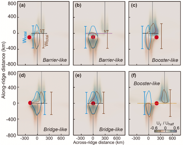 研究发现,转换断层对地幔柱沿脊轴扩散,可呈现三种可预测的作用模式,分别是:阻挡模式,即地幔柱位于洋脊外侧或附近存在长偏移(>200km)转换断层时,下游脊段内地幔柱信号明显减弱;桥梁模式,即地幔柱位于转换断层与洋脊交汇处时,断层成为物质通道,可促进地幔柱物质向两侧脊段双向扩散;增强模式,即地幔柱位于洋脊内侧或断层中心下方时,断层的走滑运动强化沿脊地幔流,使地幔柱信号放大传播。
