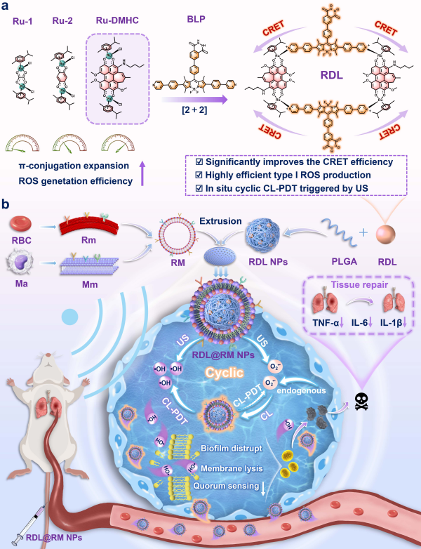 近期,中国科学院理化技术研究所研究团队在深部细菌感染治疗领域取得进展。研究团队开发了超声触发的I型超分子光敏剂RDL@RM NPs,通过超声触发与分子内化学发光共振能量转移协同驱动的原位循环光动力疗法,克服了传统光动力疗法组织穿透浅、疗效受限的挑战,为肺炎等深部感染的精准治疗提供了新思路。