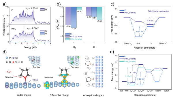 针对这一难题,中国科学院长春应用化学研究所研究团队设计并合成了镍单原子表面调控的铂基催化剂(PtNi1)。该设计利用Ni单原子通过“配体效应”优化Pt位点的电子结构,促进氢中间体(H*)的吸附—脱附行为,有效降低了决速步能垒,从而加速了HOR本征动力学。研究构筑的对四氢呋喃(THF)电解液强吸附的Ni单原子中心,能优先吸附竞争性有机分子,避免了Pt位点被毒化失活,同时提高了THF自身的氧化分解能垒,从而抑制Pt位点上发生溶剂氧化反应。