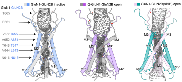 研究团队还在内源性GluN1-GluN2B受体中捕获到一个此前从未观察到的完全开放构象。该结构显示,受体通道门控M3 helix在GluN1和GluN2B两个亚基中均发生明显的向外旋转,导致离子通道孔径显著扩大,从而实现真正意义上的通道开放。