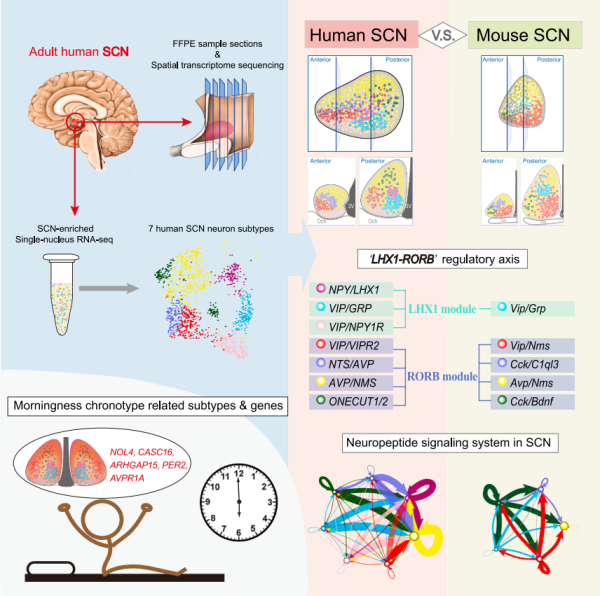 近日,中国科学院脑科学与智能技术卓越创新中心团队等,在单细胞水平上重构了人类视交叉上核(SCN)——调控昼夜节律行为的核心脑区的细胞构筑与空间转录组图谱,并解析了人类SCN的神经元亚型。该研究通过对图谱的深度挖掘,揭示了人类SCN特有的神经肽信号通路和跨物种保守的基因调控程序,并发现了与人群中时型差异相关的潜在神经机制。