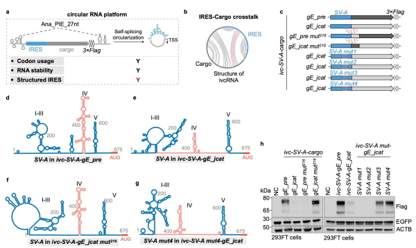 研究基于高效的自剪接成环系统,构建了不同病毒来源IRES以及相同荧光素酶报告基因的ivcRNAs。研究同时利用相关技术,在活细胞中直接解析长链环形RNA的二级结构。为验证IRES与cargo之间不利的相互作用会损害IRES结构并抑制翻译,研究设计了定点突变实验,在cargo区或IRES结构域IV引入点突变,以构建不同突变类型的ivcRNAs。分析显示,这些突变阻断了IRES与cargo间的碱基配对,恢复了SV-A结构域IV的十字形构象。基于此,研究通过定量指标,量化SV-A结构变化。修复SV-A结构后,gE蛋白表达完全或部分恢复,且表达水平与IRES结构域IV的结构完整性呈强正相关。