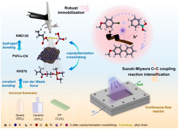 机制研究表明,该涂层通过精巧的分子级设计,协同整合了氢键、共价交联及界面锚定等相互作用力。这一“三重界面”机制使得Pd/Cu-CN光催化剂能够在温和条件下,牢固附着于石英、陶瓷甚至聚丙烯塑料等材质表面,展现出优异的基材普适性。团队进一步将该固载技术与连续流微通道反应器深度融合。在优化光学与流体动力学参数后,该系统在经典的偶联反应中展现出优异的催化效能。