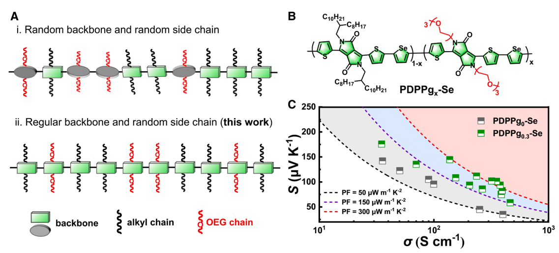 (A)主链规整而极性侧链随机分布聚合物设计策略;(B)聚合物PDPPgx-Se的化学结构;(C)FeCl3掺杂的PDPPg0-Se与PDPPg0.3-Se薄膜的热电性能对比