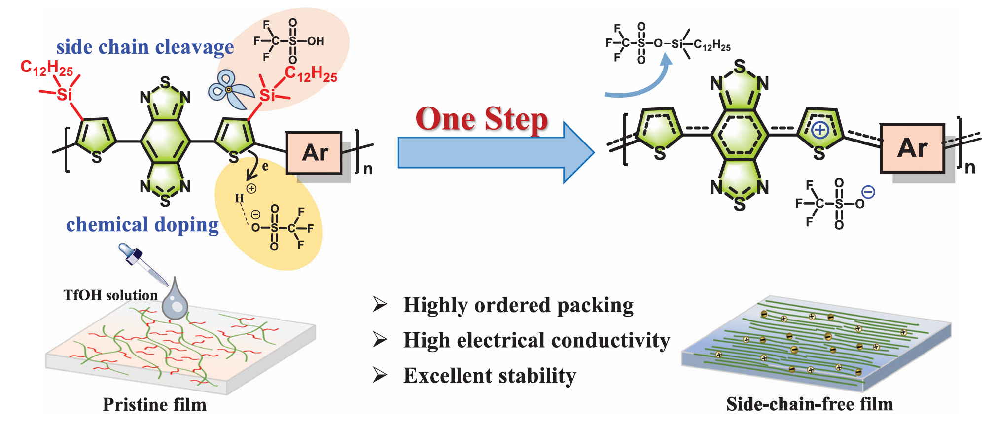 苯并双噻二唑聚合物一步完成侧链裂解与高效掺杂
