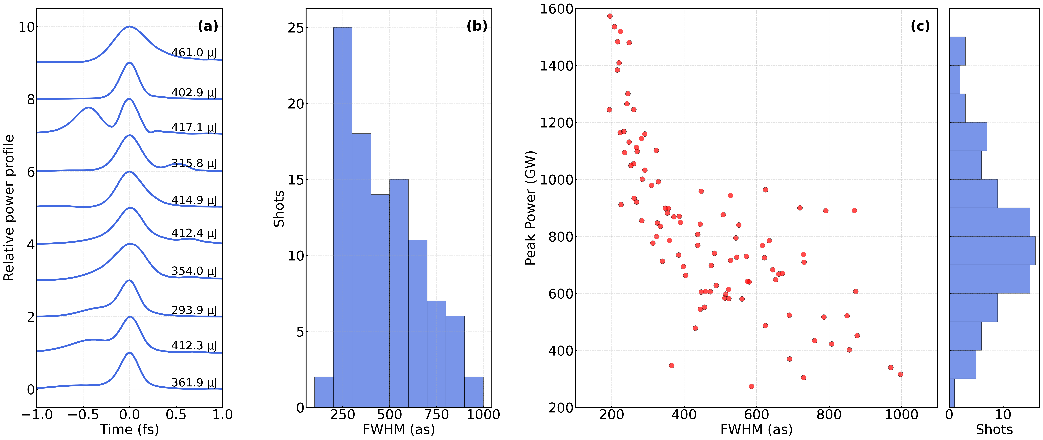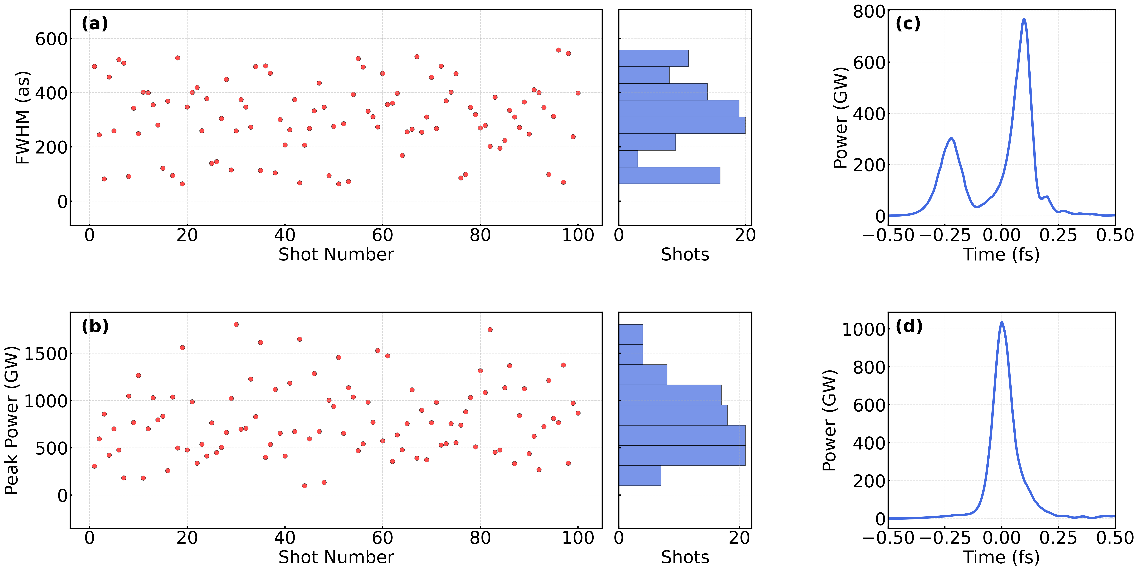 数值模拟结果表明,在考虑超导模组射频相位抖动等实际运行条件的情况下,SHINE在硬X射线波段(6keV)可产生平均脉宽约300阿秒、峰值功率约0.8太瓦的X射线脉冲;在1keV软X射线波段,可实现平均脉宽约470阿秒、峰值功率达太瓦量级的输出。
