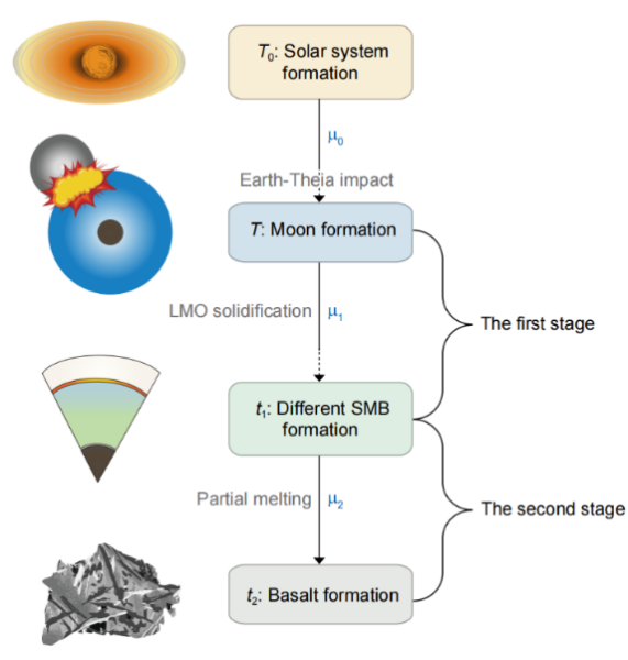 针对这一问题,中国科学院地质与地球物理研究所科研团队以月海玄武岩为研究对象,结合U-Pb同位素体系和月球岩浆洋演化模型开展研究。由于月球早期岩浆洋处于高温、充分熔融且混合均匀的状态,可视为同位素达到平衡的储库。如果月幔源区较快结晶,则对于长半衰期体系而言,其同位素体系可以视为达到了平衡,这在Sm-Nd体系的研究中得到了印证。基于这一认识,研究团队提出,不同月海玄武岩源区均由岩浆洋阶段演化而来,并具有相同的初始Pb同位素组成。这一初始Pb同位素组成既记录了从月球形成到月海玄武岩源区形成阶段放射成因Pb的累积信息,也是后续玄武岩源区继续演化的起点,通过对玄武岩源区形成时Pb比值的计算,可以建立月海玄武岩样品与月球早期演化之间的联系,进而利用玄武岩样品的Pb同位素数据反演月球的形成时间。